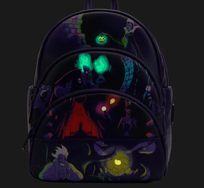 Pick your poison! Three perfectly wicked scenes unfold on this Loungefly Disney Villains Triple Pocket Glow-in-the-Dark Mini Backpack. With three pockets and scenes to choose from, you’ll love tucking away all the things you need to have a scream of a day. Ursula and Dr. Facilier share the spotlight on the first pocket. Below, Ursula’s minions, Flotsam and Jetsam, circle their tails around the cauldron that holds Ariel’s locket—and her voice. An eager Ursula looks ready to wrap her tentacles around the prize. In the dark, the locket and the light surrounding it, glow an eerie golden hue. Above them, Dr. Facilier invites you to see what’s in the cards. He stands before the table set for two, with the curtains drawn open, inside Dr. Facilier’s Voodoo Emporium. It looks like a transformation, with the help of friends from the other side, is about to take place! The mask locket that unleashes mysterious powers glows red—along with the inside of the tent—in the dark. This magical moment, in the dark, draws further light from the globe at the top of Dr. Facilier’s cane, which glows a purplish red. In the middle compartment, Hades holds a blue flame in his fingertips, while Pain and Panic tremble and cower with fear. In the dark, the flame in Hades’ fingertips glows blue—along with his hair and the light cast along the brick that arcs over the scene. At the very top, the Evil Queen reigns supreme—having just dipped the apple into the poison cocktail. It drips into the shape of a deadly skull—and in the dark, it glows a ghastly green—along with a faint light that reflects onto the Queen’s chest and her eyelids. On the back, the symbol for each villain makes an appearance, including the poison apple, a blue flame, a conch shell, and a colorful mask. It’s the perfect accessory for packing all the items necessary to have a spellbinding day—or for transforming everyday travels into frightfully fun adventures.