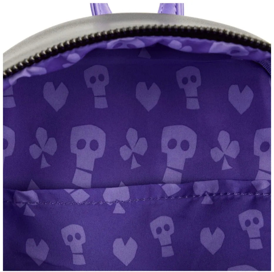 Oogie Boogie has sent his finest trick-or-treaters to carry out his dastardly plans. Stay on his good side, or he may send his mischievous henchmen after you! The Loungefly Nightmare Before Christmas Glow Triple Pocket Lock, Shock, and Barrel Oogie Boogie Mini Backpack features Oogie Boogie as he spins on a roulette wheel. Up above, Lock, Shock, and Barrel can be found lurking in some spooky hideaways of Halloween Town. Turn the bag around to find Oogie’s dice, waiting to decide your fate! This frightfully fun accessory glows in the dark and has plenty of room for storing your tricks and treats.