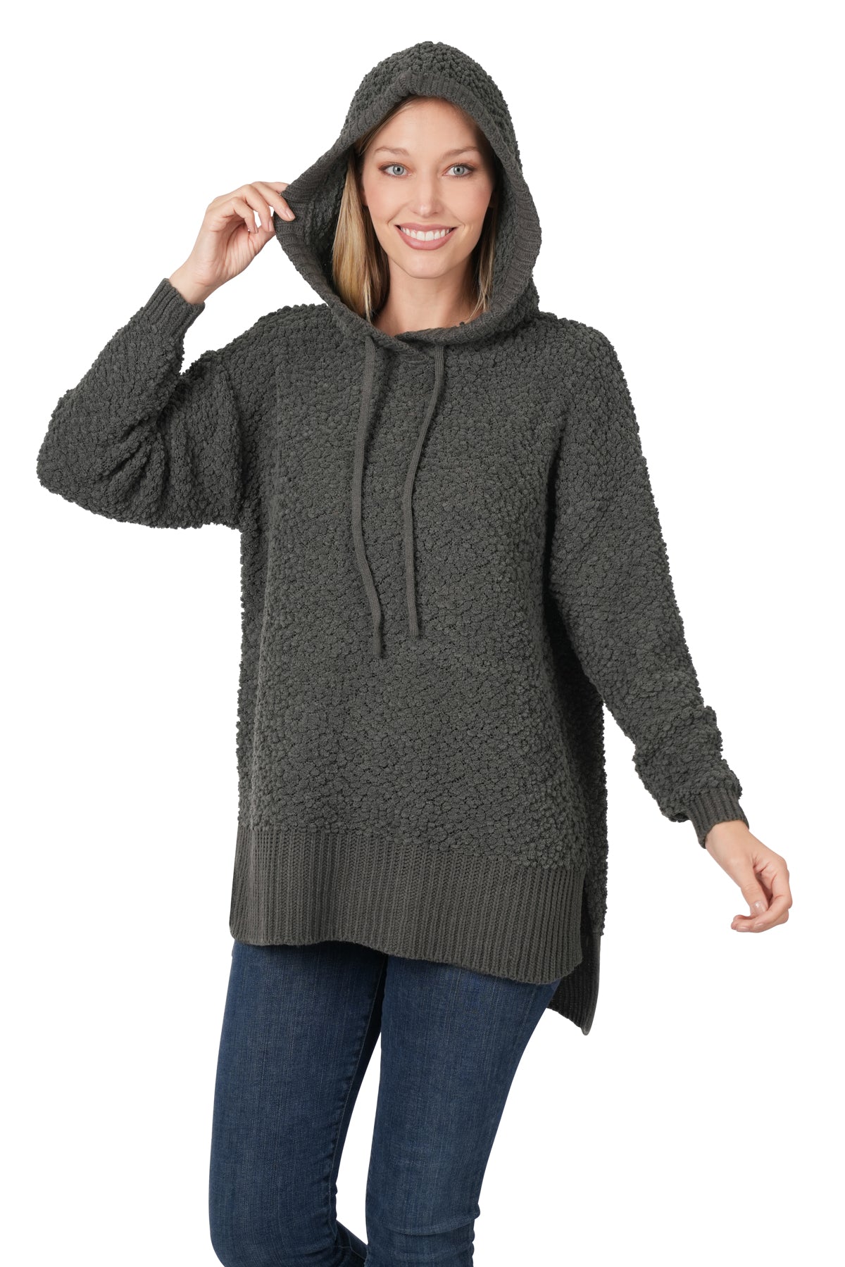HOODED HI-LOW HEM POPCORN SWEATER (ASH GREY)